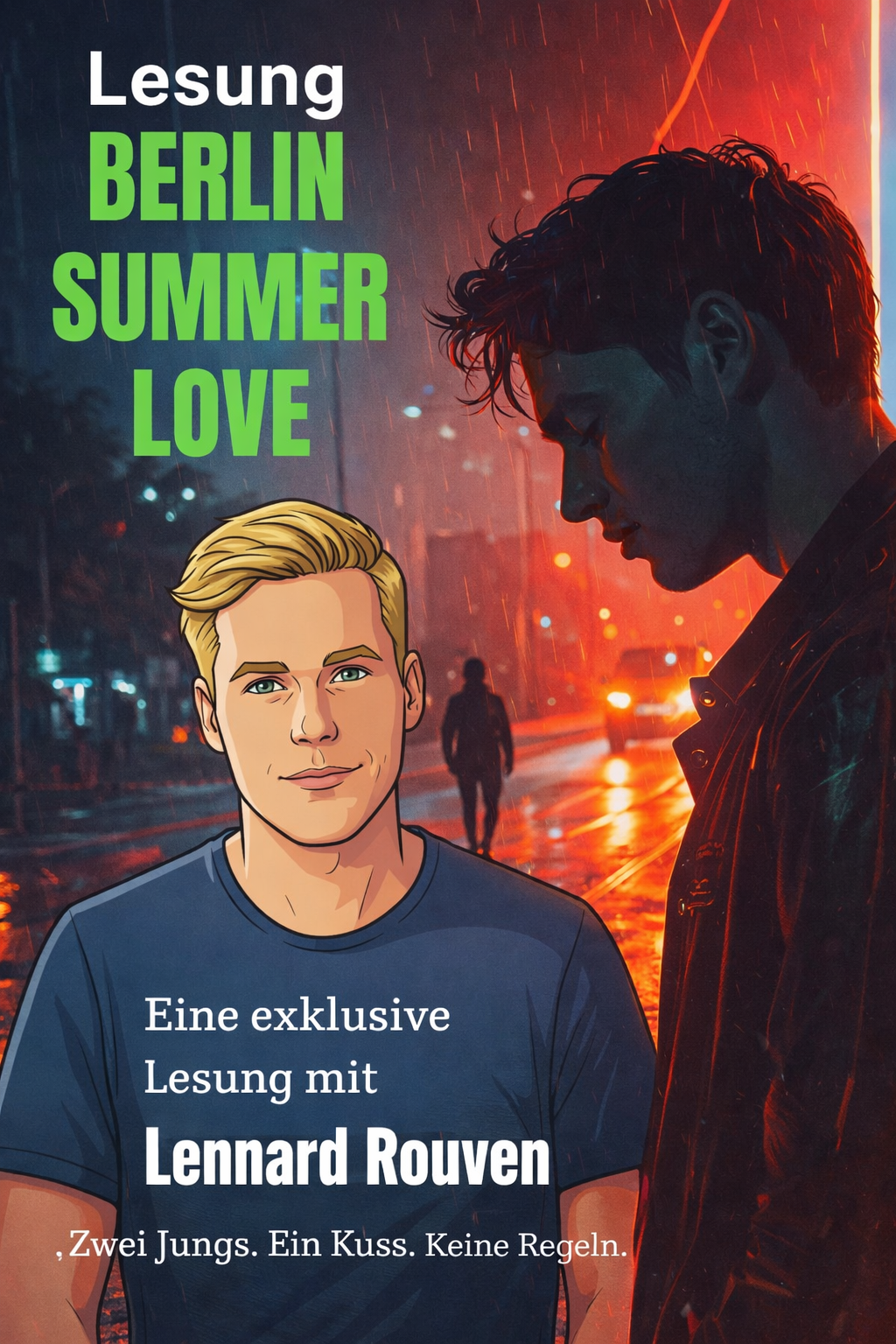 Der Autor kommt nicht aus Berlin, aber der Berlin-Vibe reist mit: Großstadtenergie, queere Sehnsucht, Sommernächte, die zu Geschichten werden. Für Lesungen in Buchhandlungen, Kulturorten und literarischen Räumen.